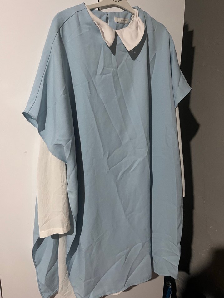 Mavi midi uzunlukta, kısa kollu, beyaz yakalı, dökümlü kadın tunik. Sentetik kumaştan yapılmış, günlük kullanım için uygundur. İkili olarak satılık 85 kiloya kadar olur