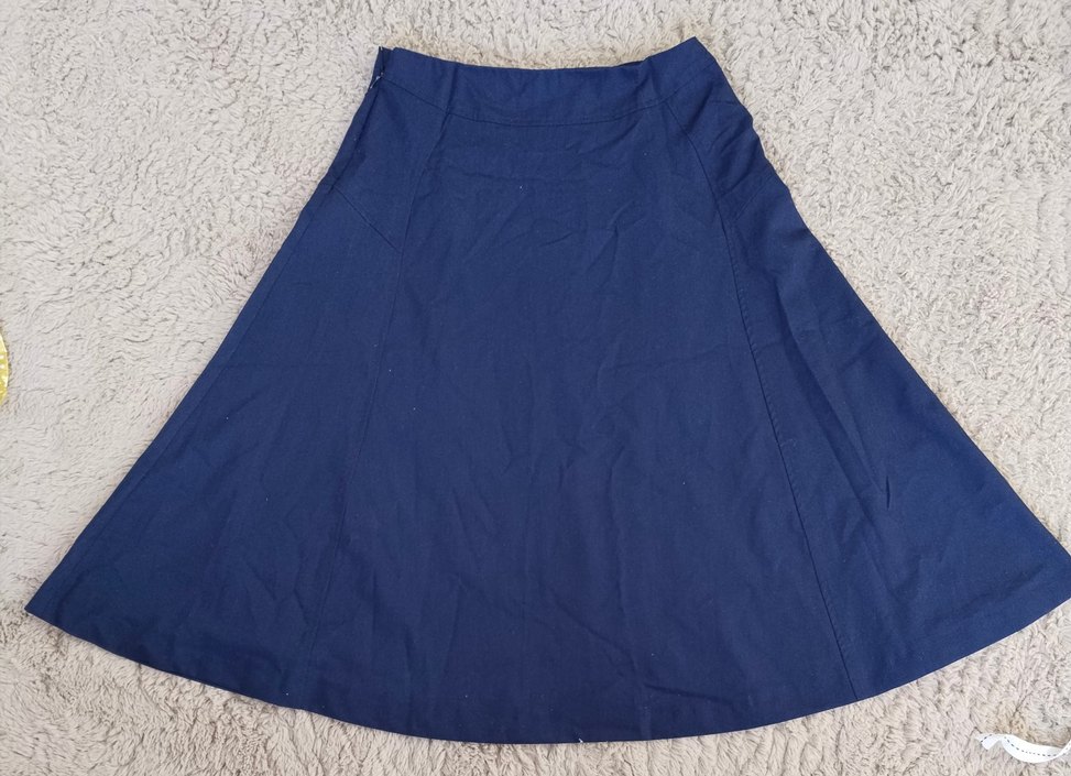 Mavi midi uzunlukta, bol kesim kadın eteği. Sentetik kumaştan yapılmış, desensiz ve rahat bohem tarzda, dış mekan kullanımı için uygundur.