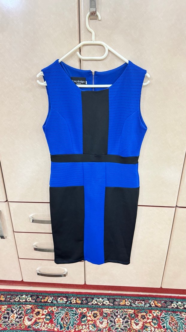 Kemer görünüm detaylı, kolsuz midi kalem elbise. V yaka ve koyu mavi-siyah renk kombinasyonuyla ofis için uygun şık tasarım. Xl yazıyor beden ama vücudu saran çok ta esnemeyen bi kumaş m ve l bedenlerde tercih edebilir