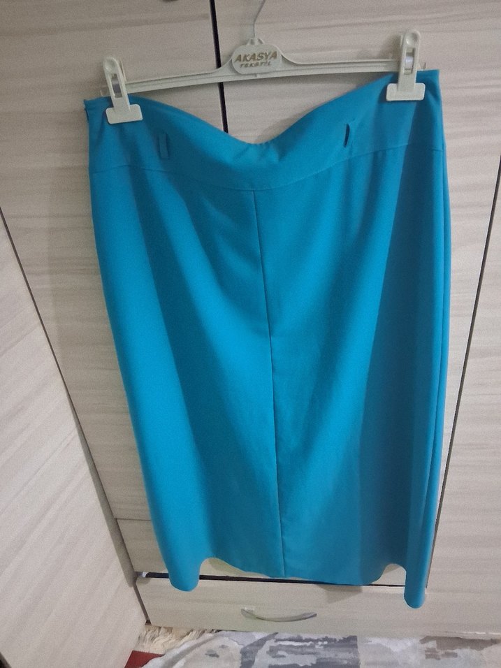 Mavi midi hamile eteği, parlak sentetik kumaştan olup, drapeli ve normal kesimlidir, iş ortamları için uygundur.
