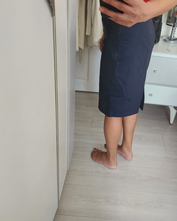 Mavi renk, sentetik kumaştan yapılmış, diz altı kalem kesim, ofis için uygun, zahmetsiz şıklık sunan etek.