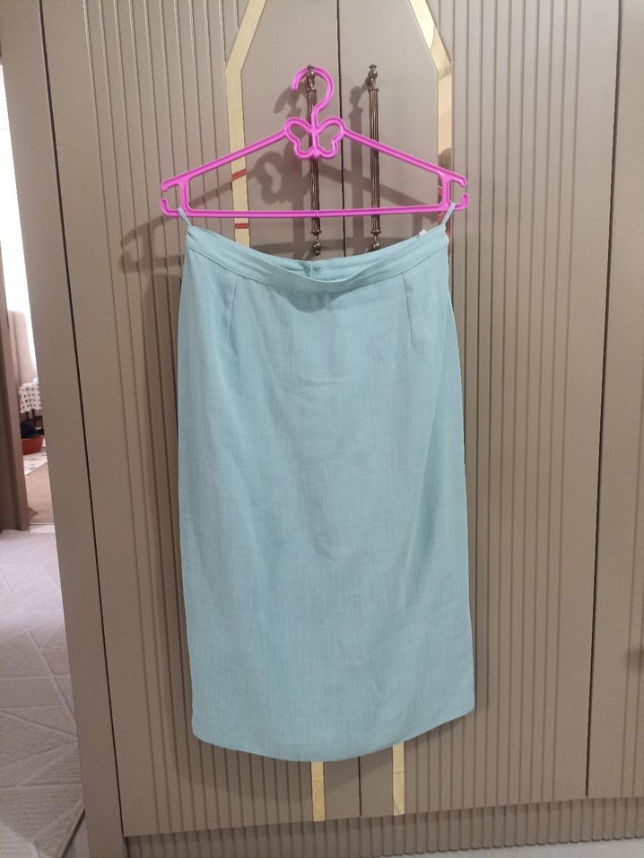 Pastel mavi keten kumaştan, drapeli ve diz boyu, ofis için uygun, minimal tarzda fitted etek