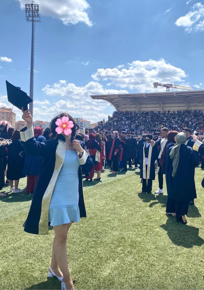 Mavi midi mezuniyet elbisesi, kalın askılı kollar ve batik desen içerir. Düzenli kesim detaylarıyla minimalist ve avant-garde tarzı bir araya getirir. 1 kere giyildi