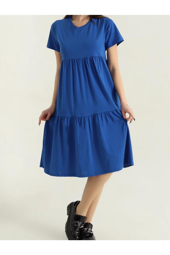 Rahat kesimli midi elbise, kısa kollu, yuvarlak yakalı ve fırfır detaylıdır. Sentetik kumaştan yapılmış, günlük kullanım için renkli ve konforludur.