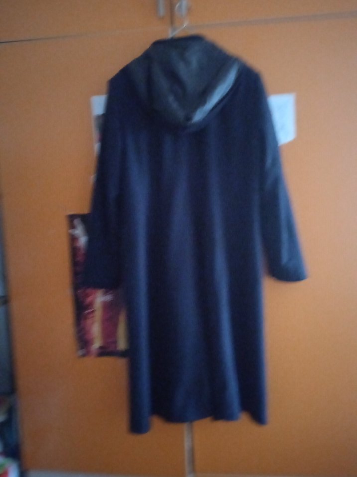 Koyu mavi, uzun kollu, bol kesim midi kaban. Yüksek yakalı ve dökümlü, günlük rahat kullanıma uygun.