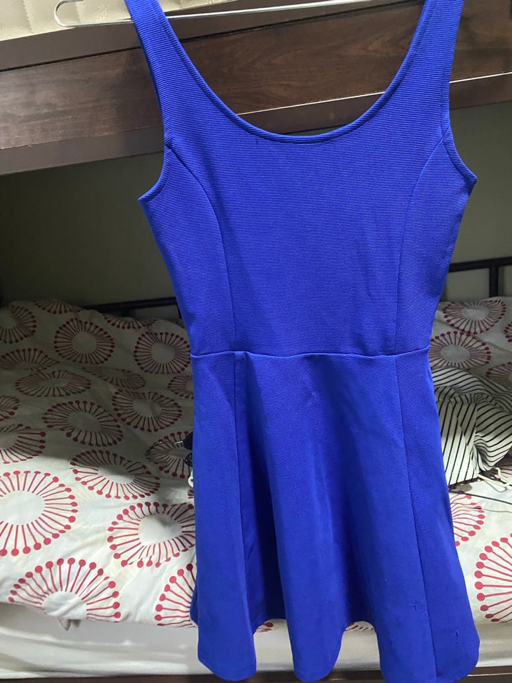 Mavi, askısız, triko kumaştan, straplez yaka ve pileli etekli, normal midi boyda, dar kesim günlük sokak tarzı elbise. S ve m bedene uygundur