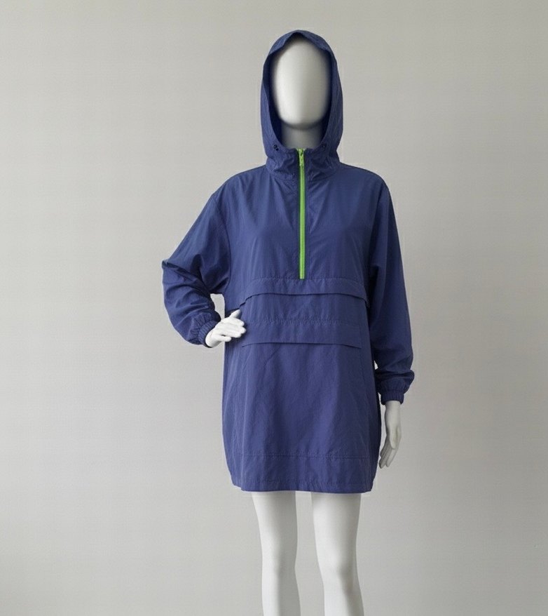 Mavi renkli, bol kesim midi uzunlukta yağmurluk. Yüksek yakalı, uzun kollu ve önden fermuarlı. Parlak görünümlü keten kumaştan, günlük kullanıma uygun şık sokak stili.