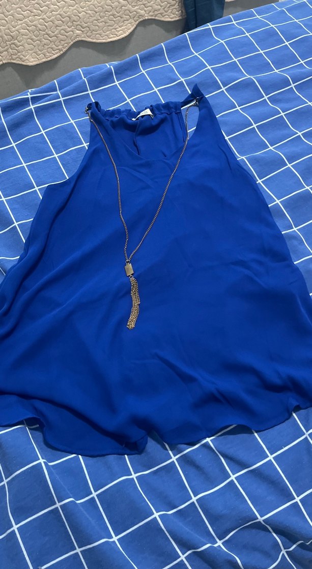 Parlak mavi zincir detaylı, midi uzunlukta kadın kolyesi, bohem tarzda günlük kullanıma uygun.