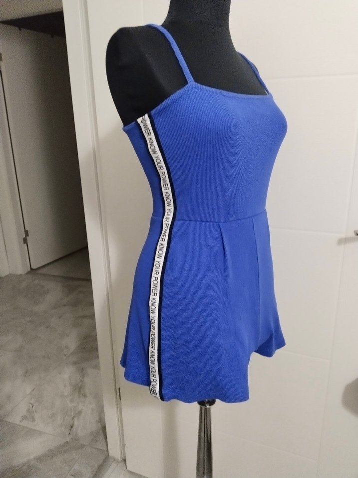 Mavi mini tulum, ince askılı ve elastik yan detaylıdır. Günlük kullanım için uygun, sade ve fit kesimlidir. 34 36 beden e uygun manken m beden duruşu böyle
