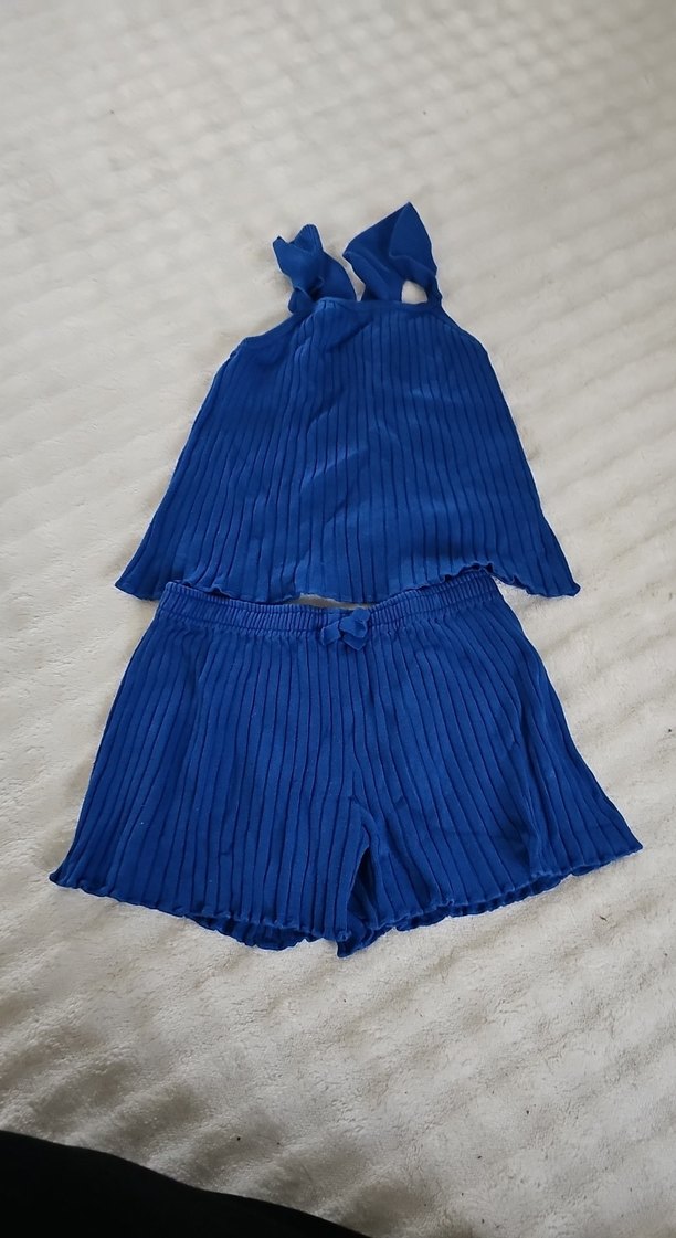 Mavi mini kız çocuk takımı, askılı üst ve rahat kesim. Yumuşak, konforlu kumaştan, renkli ve rahat sokak stiline uygun.