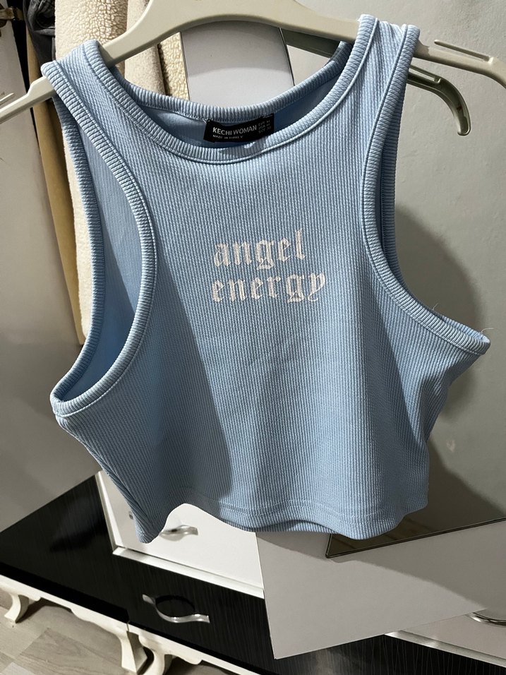 Pastel mavi renkte, kısa kesim ve bisiklet yaka olan bu atlet, yumuşak sentetik kumaştan üretilmiştir. "angel energy" baskılı, spor ve günlük kombinlere uygun.