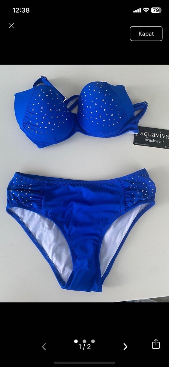 Sıkı kesim mavi bikini, taş detaylı ve ince askılıdır. Aquaviva Beachwear markasına ait kısa ve gösterişli bir plaj kıyafetidir. ️