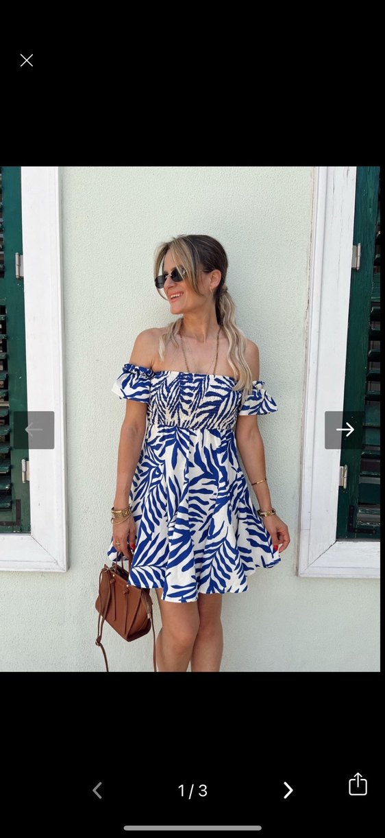 Mavi renkli, straplez mini elbise, bol kesim, fırfırlı detaylı ve batik desenlidir. Yumuşak sentetik kumaştan üretilmiştir.