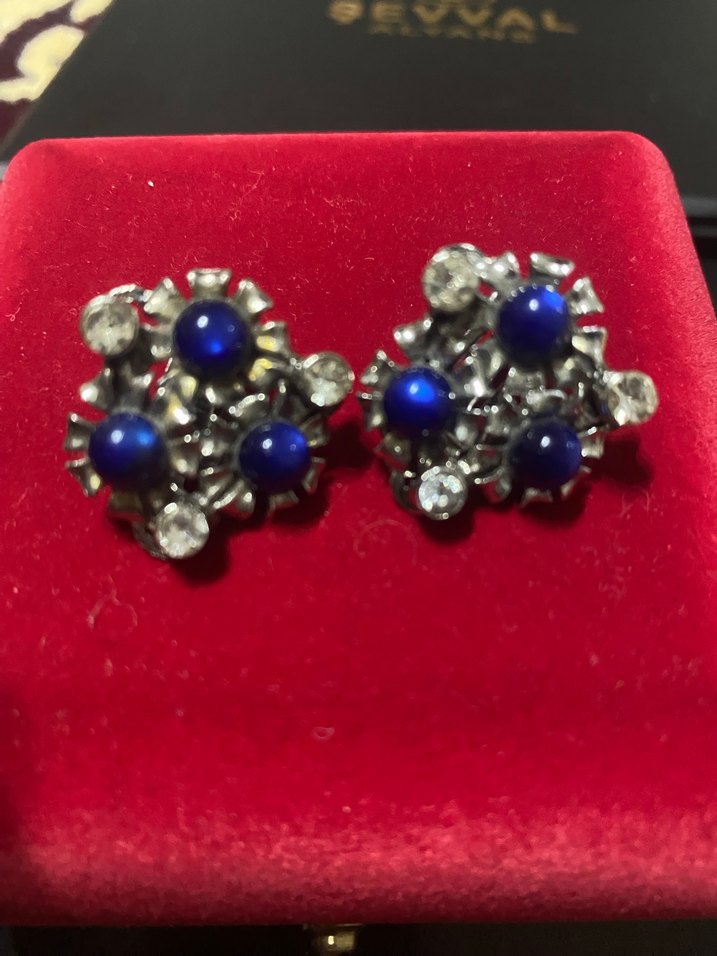 Mavi boncuklar ve şeffaf taşlarla süslenmiş kısa, mini uzunlukta çiçek desenli payetli küpeler. Vintage tarzıyla düğün ve özel günlere renk katıyor. Vintage küpe #vintage