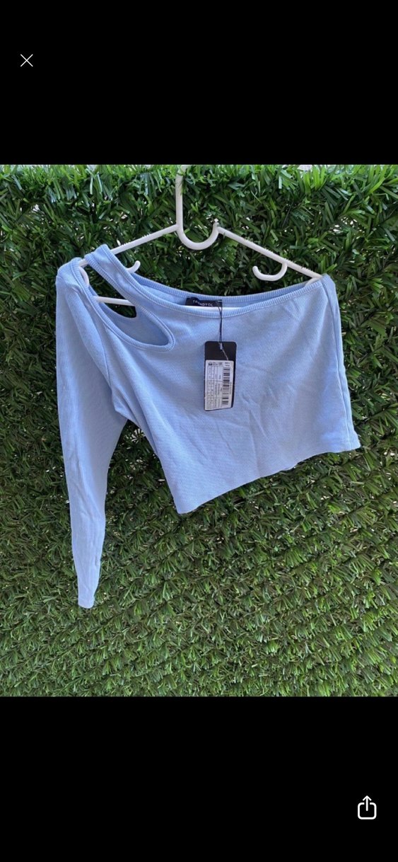 Pastel mavi renkte, uzun kollu ve kruvaze yaka olan bu mini crop top, tek omuzda şık kesim detayıyla rahat ve şık bir görünüm sunar.