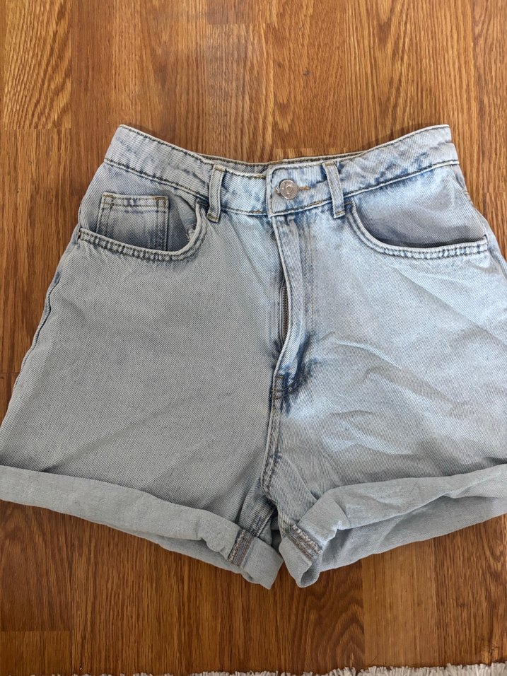 Mavi renk, bol kesim mini denim şort, kısa boy ve kıvrılmış paçalarla rahat ve şık bir günlük stil sunar.