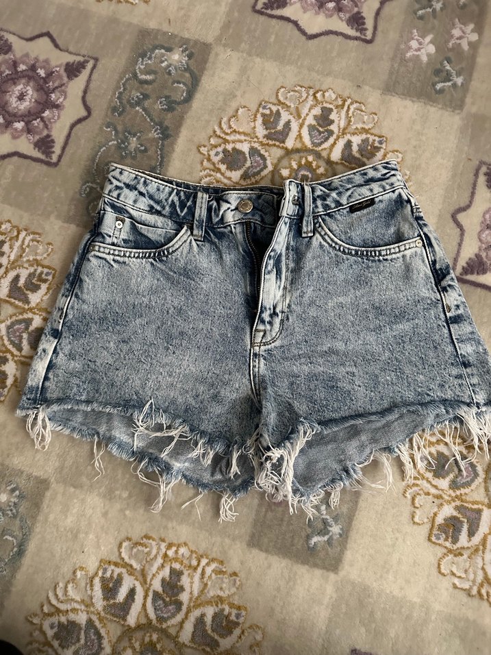 Gevşek kesim, mavi denim mini şort, yıpranmış kenarları ve bağlamalı detaylarıyla günlük sokak tarzına uygun.