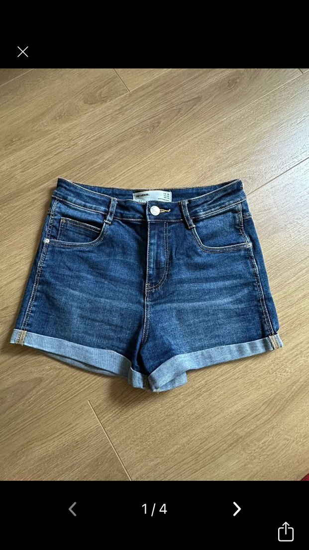 Kadınlar için mavi renkli, kısa paçalı, dar kesim mini denim şort. Yepyeni