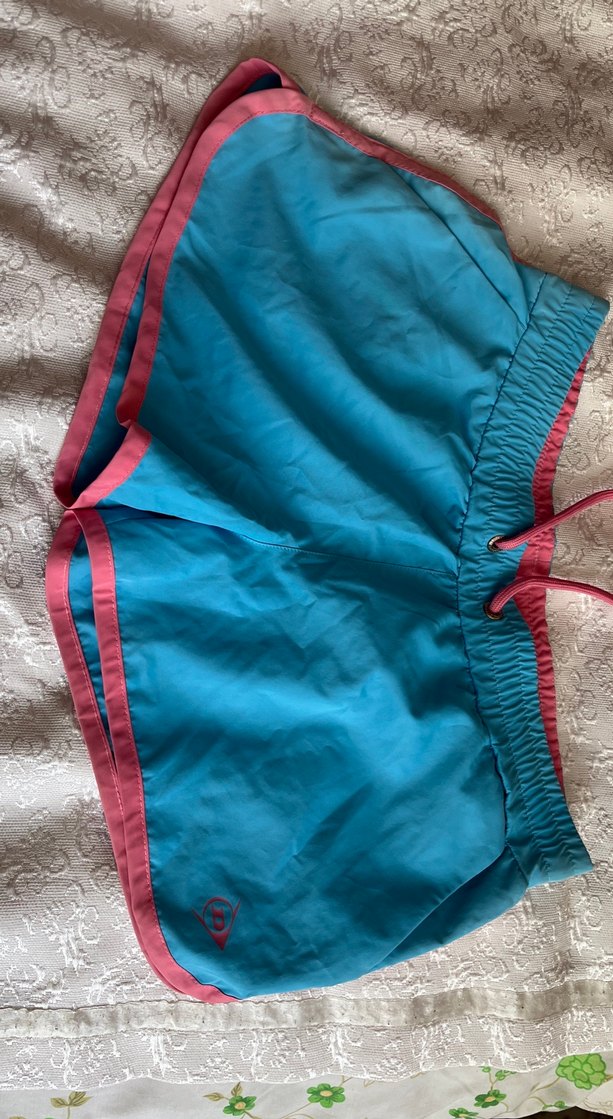 Sentetik kumaştan yapılmış, fermuarlı cepli, pembe detaylı pastel mavi mini şortu. Plaj ve günlük sokak stiline uygun.