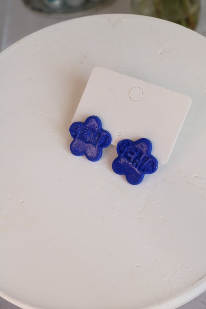 Canlı mavi renkte, kısa uzunlukta, düğmeli ve baskılı çiçek desenli mini küpeler. Evde rahat minimalist sokak stili için uygundur.