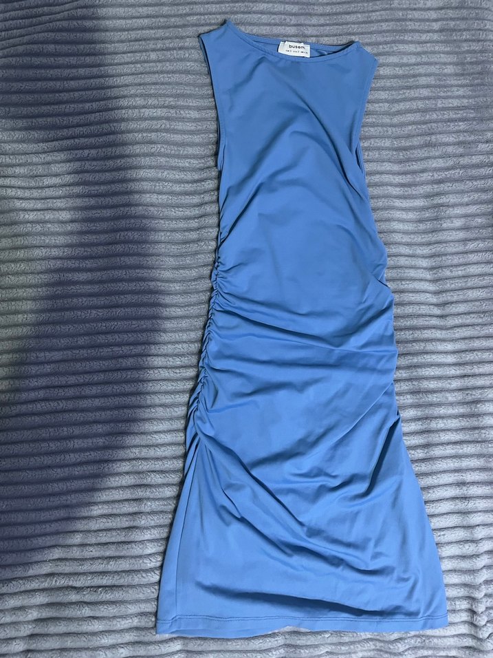 Drapeli tasarıma sahip, mavi renkli, elbise . Hiç kullanmadım etiketi kesip yıkadım sıfırdır. Büzgü detayından dolayı bele tam oturan bir elbise . Butik ürünüdür.