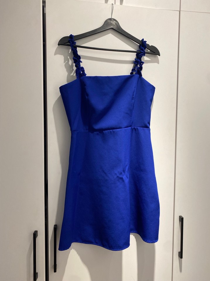 Parlak kumaştan, fitted kesim mavi mini elbise, fırfırlı askılarla, şık ve romantik akşamlar için uygun.