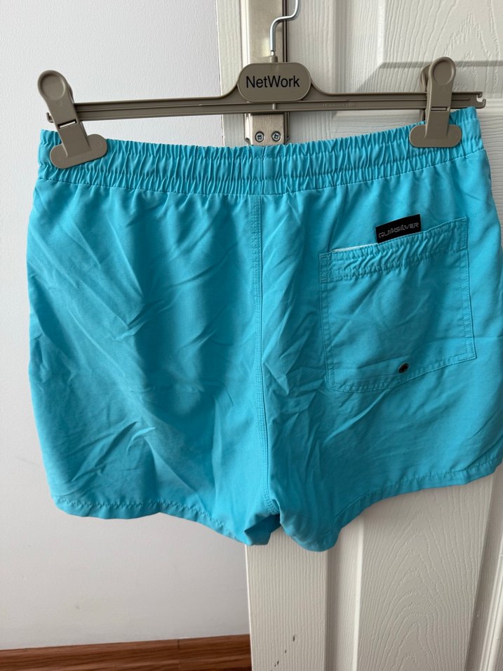 Parlak mavi, bol kesim erkek deniz şortu, kemerli ve arka cepli. Plaj ve sokak stili için uygundur.