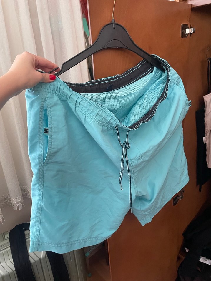 Pastel mavi renkte, fermuarlı ceplere sahip, bol kesim kısa erkek deniz şortu. Sokak stiliyle plaj kullanımı için uygundur.