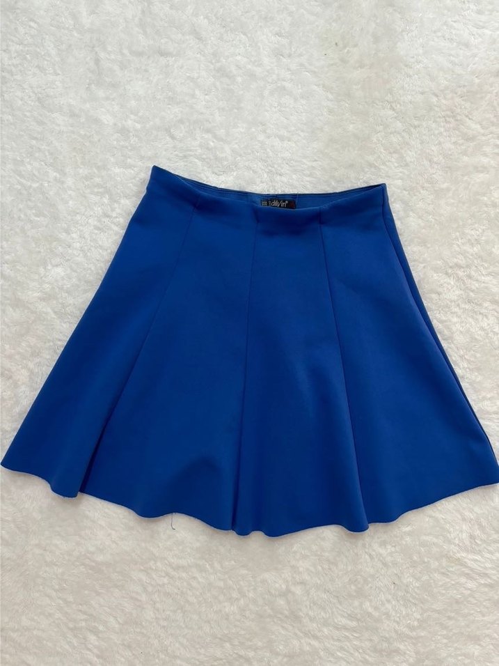 Mavi renkte, yumuşak ve sıcak dokulu fleece kumaştan yapılmış mini etek. Salaş kesimi ve fırfırlı kenar detayı vardır. Parlak görünümü günlük kullanıma uygundur.