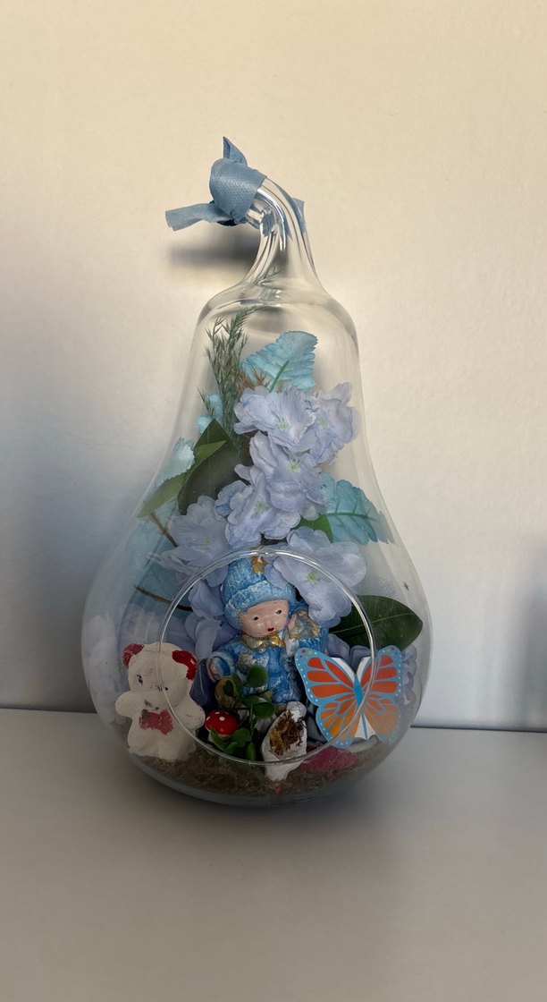 Mavi yapay çiçekler, küçük bir bebek figürü ve renkli kelebek ile ayıcık detayları içeren armut şeklinde cam dekoratif süs.
