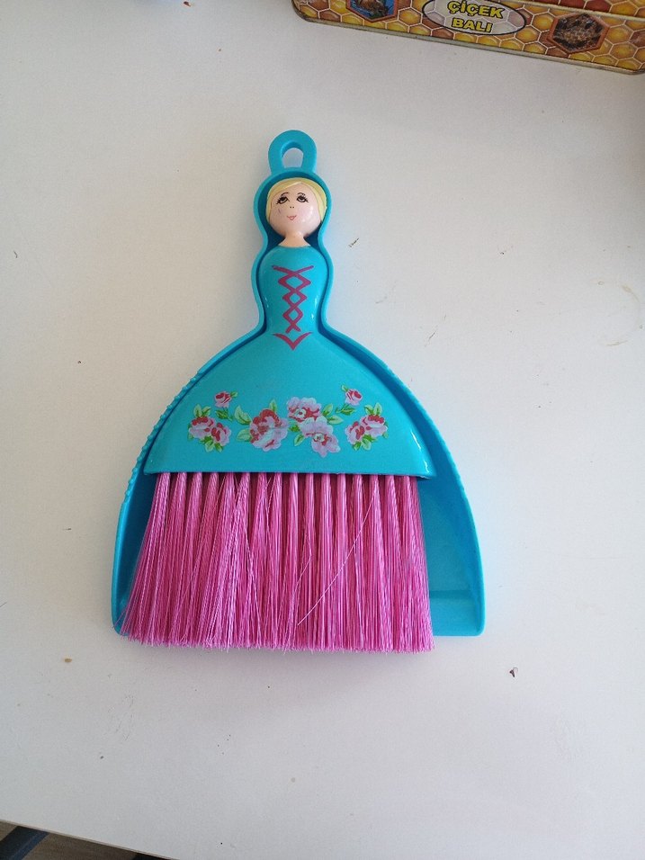 Mavi, bebek figürlü sap ve pembe kıllara sahip, çiçek desenli küçük fırça seti.