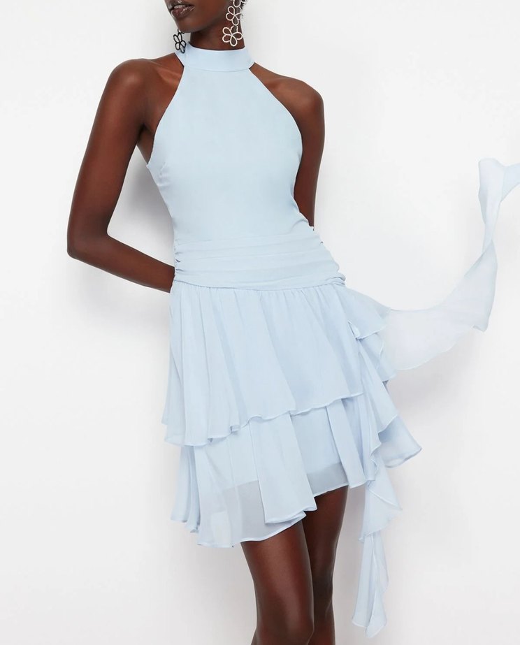 36 beden için uygun, geniş kalıp ürün. Mavi, yüksek yakalı, kolsuz, vücuda oturan mini elbise. Katmanlı fırfır detayları ve yumuşak sentetik kumaş.