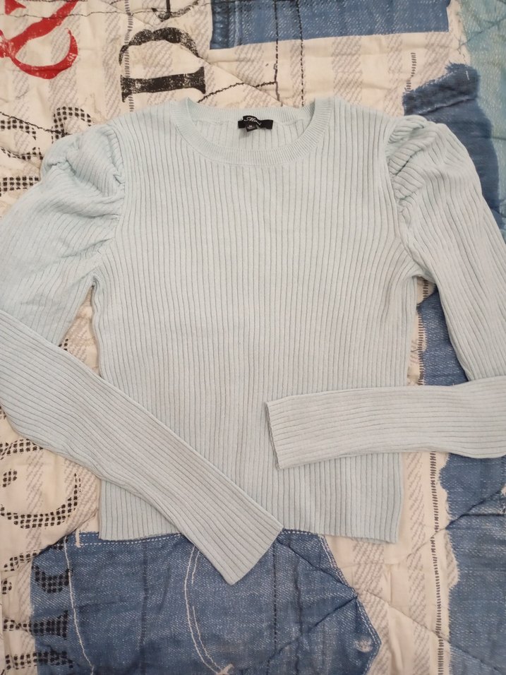 Uzun kollu, yuvarlak yaka ve fit kesimli, yumuşak triko kumaştan yapılmış bebek mavisi mini kazak. Sokak stiline uygun rahat ve sıcak bir tasarım. S-M uyumludur