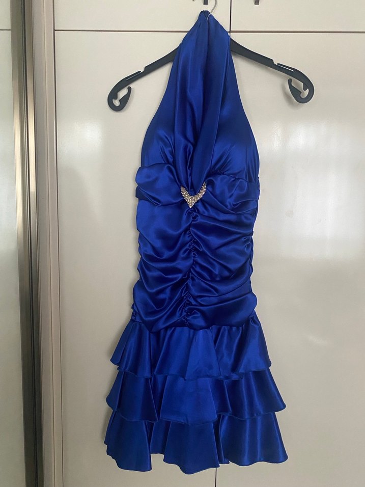 Mavi, parlak kumaştan yapılmış, halter yaka ve ince askılı, vücuda oturan mini abiye elbisedir. Fırfır ve büzgü detaylarıyla şık ve gösterişlidir.