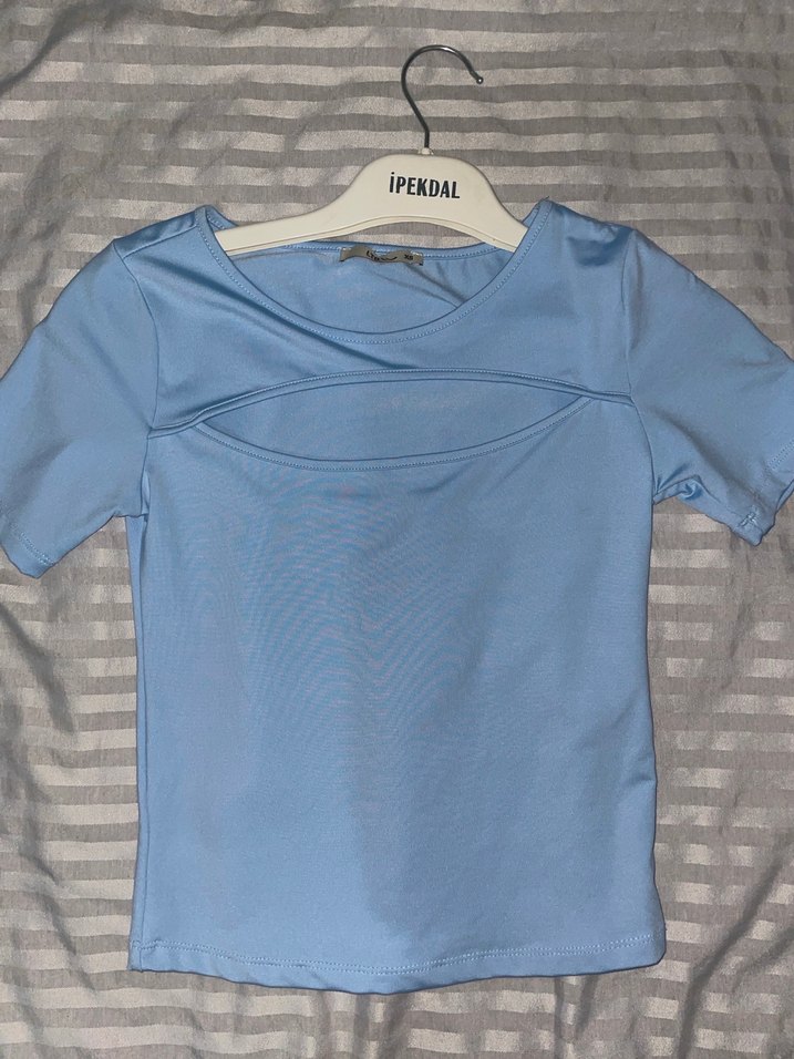 Pastel mavi renkte, kısa kollu ve yuvarlak yaka, hamileler için tasarlanmış dar kesim mini tişört. Yumuşak sentetik kumaştan, rahat ve şık bir dış mekan görünümü sunar.