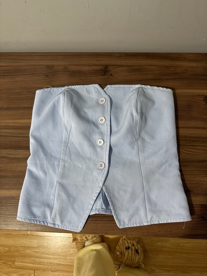 Bu pastel mavi mini korsesi, kısa boyu ve düğmeli kapamasıyla sade ve şık bir görünüm sunar. Cep vardı cebi söktüm dikiş izi var görünüyor resimde