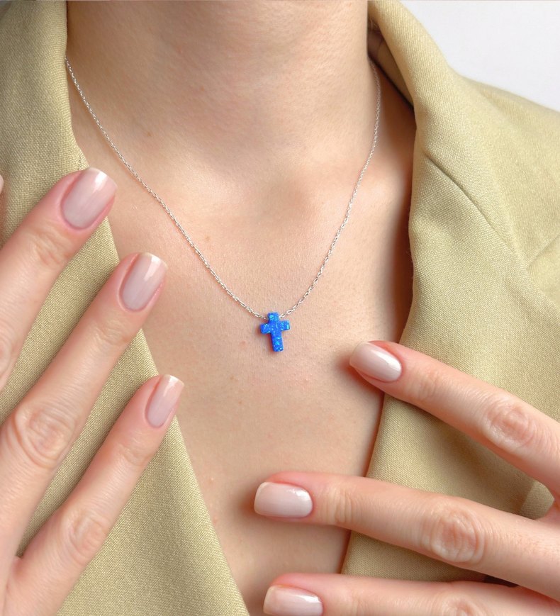Kadınlar için kısa zincirli, mavi boncuk işlemeli haç kolye, sade ve çağdaş tarzda günlük kullanım için uygundur.