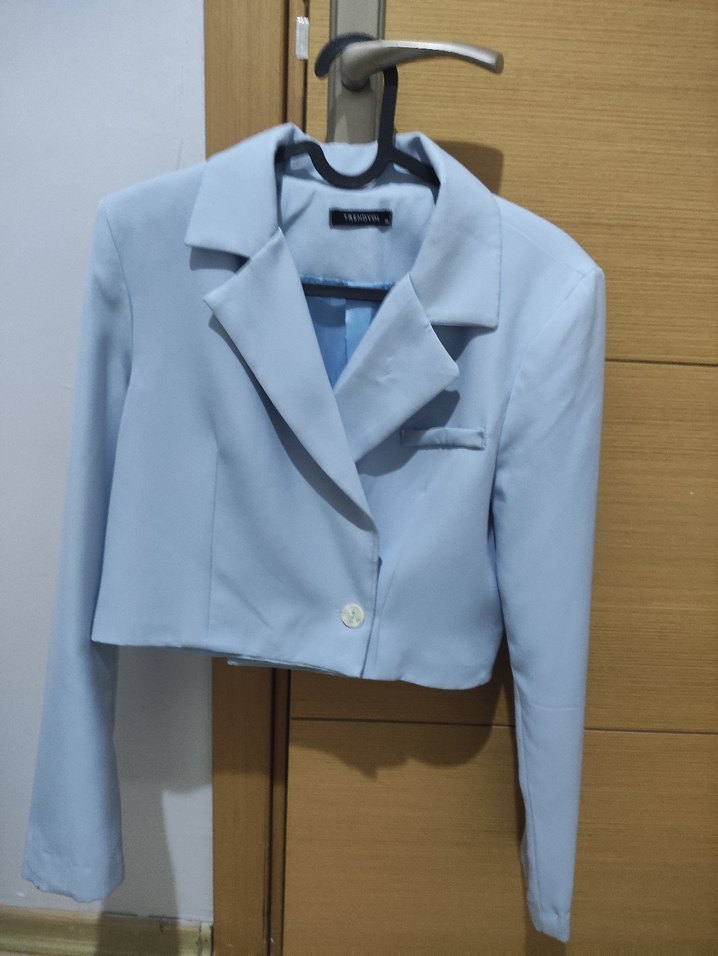 Pastel mavi renkte, yakalı ve düğmeli kısa mini kadın blazer ceket. Uzun kollu ve sentetik kumaştan üretilmiştir, ofis ve günlük kullanıma uygundur.
