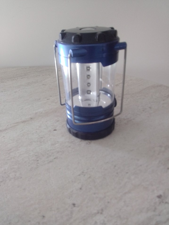 Mavi renkte, taşıma kulplu, çoklu LED ışıklı küçük kamp lambasıdır.