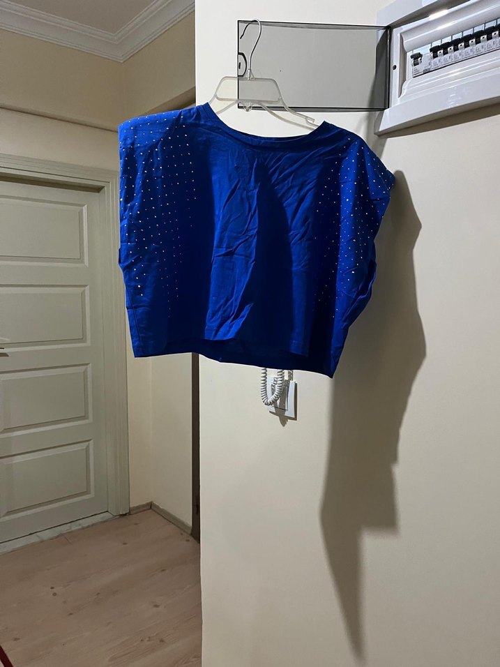 Parlak mavi renkli, kısa kollu, yuvarlak yaka ve düğmeli mini bluz, rahat kesimiyle trend sokak stiline uygundur. ✨