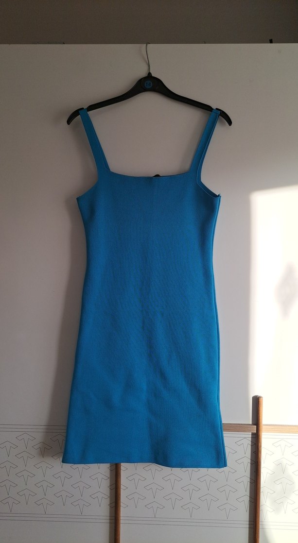 Mavi renkte, düz yakalı ve kolsuz tasarıma sahip, vücuda oturan örme elbise. Sentetik kumaştan üretilmiş, minimalist sokak stili sunar.