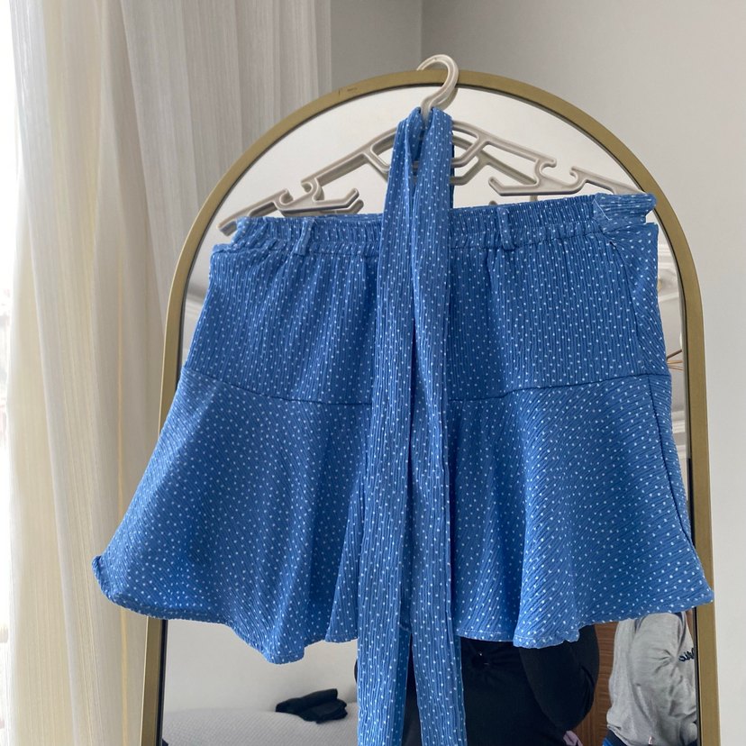 Mavi mini kot etek, bol kesim ve fırfır detaylıdır. Yumuşak denim kumaştan yapılmış, parlak batik desenlidir. Bohem tarz için uygundur.