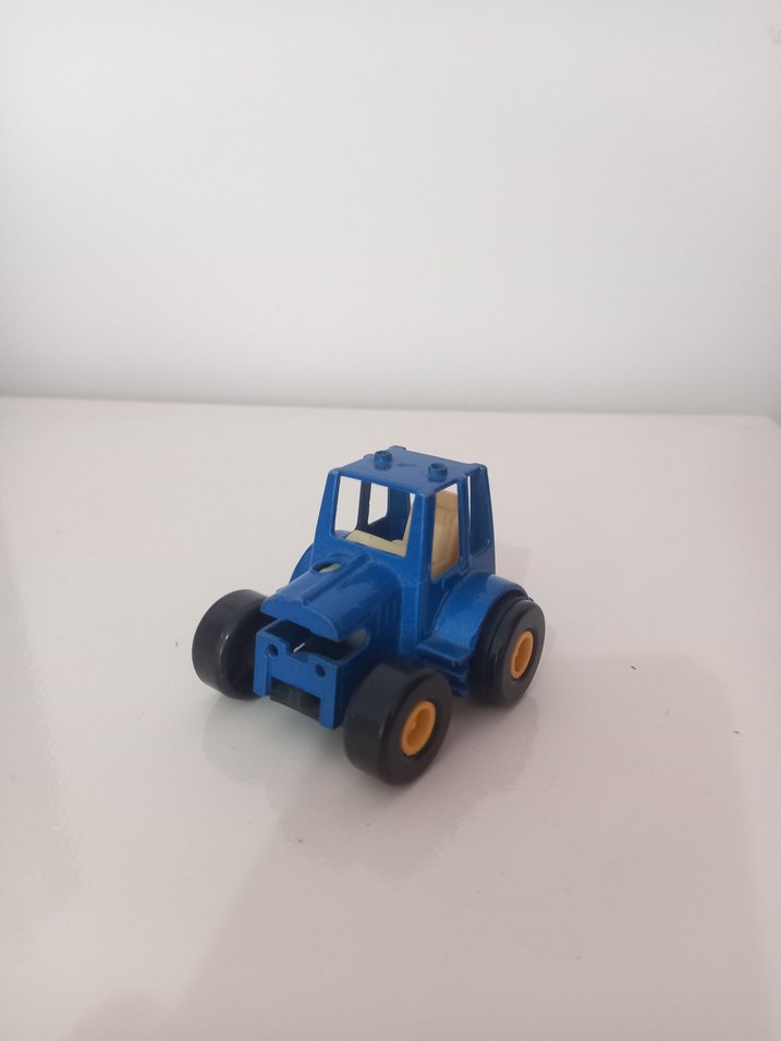 Mavi renkte küçük oyuncak traktör, tekerleklerde renkli sarı detaylara sahip. 6 cm boyunda çek bırak traktör. Eksikli bir üründür. İnceleyip alırsanız sevinirim.