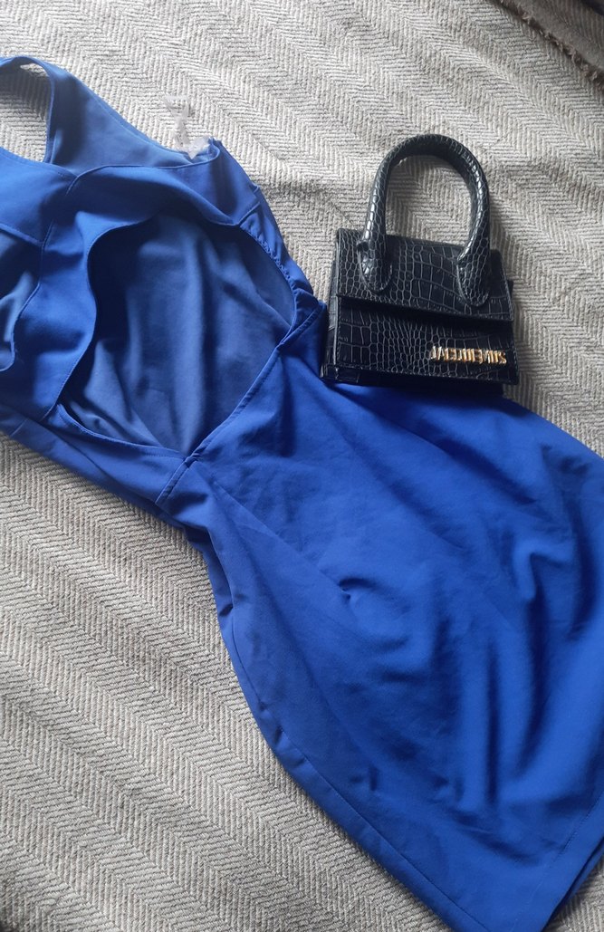 Mavi kumaştan, sırt dekolteli, askılı, kısa mini kesim elbise. Az kullanılmıştır. S-M uyumlu