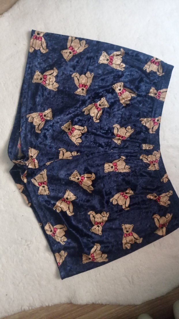 Yumuşak kumaştan, pijama alt, bol kesim mavi mini şort. Ayıcık desenli, rahat ve sokak tarzına uygun. kadife Almanya'dan alındı