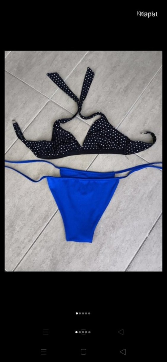 Koyu mavi renkte, ince bantlı üst ve mini alt parçadan oluşan, sokak stiliyle şıklığı birleştiren, fit kesim bikini takımı.