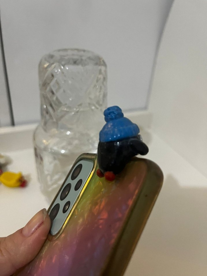 Telefon kılıfının arkasına takılı küçük mavi telefon tutucu figür, cihazınıza eğlenceli bir dokunuş katıyor.
