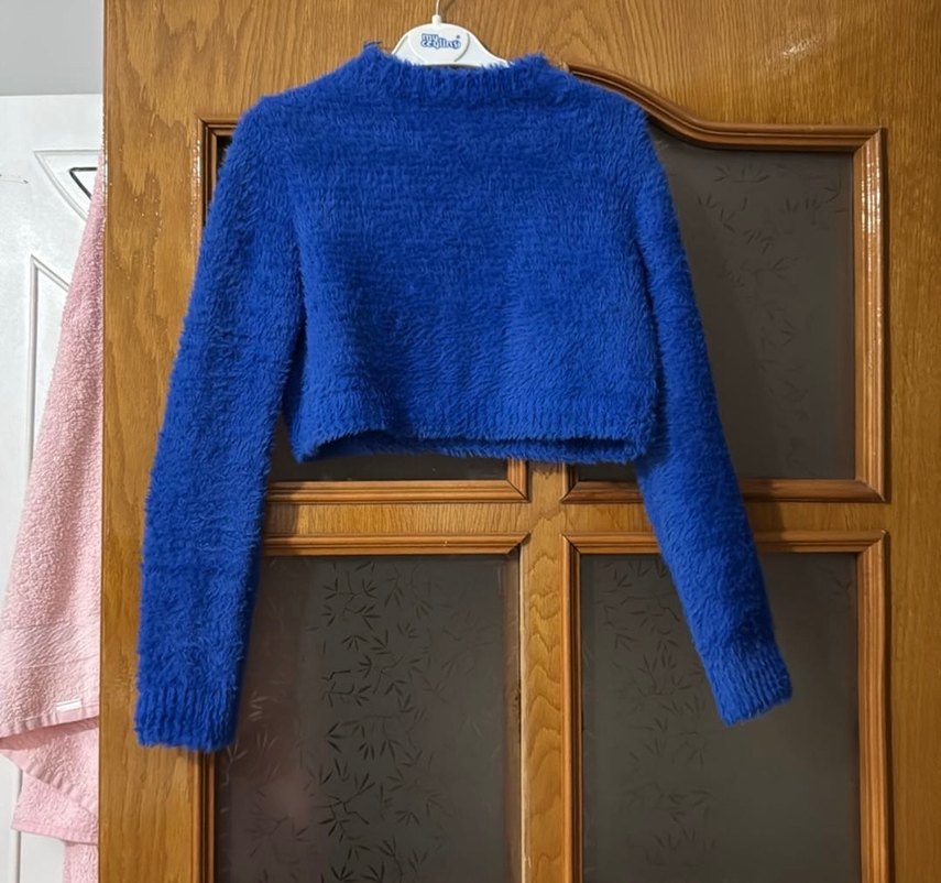 Uzun kollu, bisiklet yaka, mavi mini triko kazak. Parlak ve desensiz, rahat günlük kullanıma uygun bir parça.