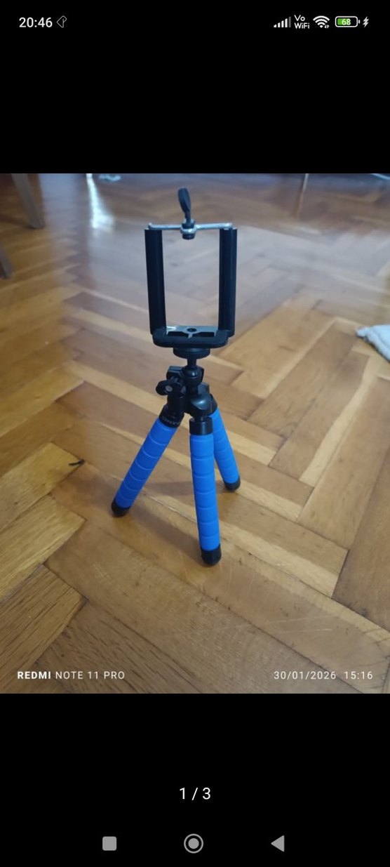 Ayarlanabilir telefon tutuculu mavi mini tripod. Çoğu akıllı telefonla uyumlu, kompakt ve taşınabilir.