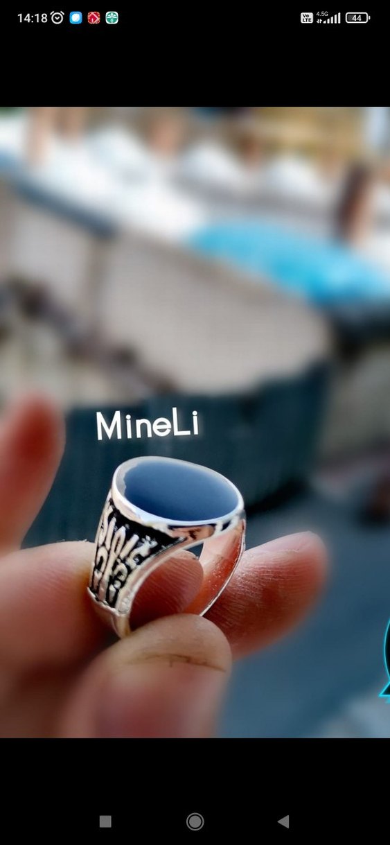 Koyu mavi taşlı ve işlemeli gümüş bantlı minimalist erkek yüzüğü, bohem ve retro tarzlarını yansıtıyor. Üzerinde 'MineLi' yazısı bulunur.